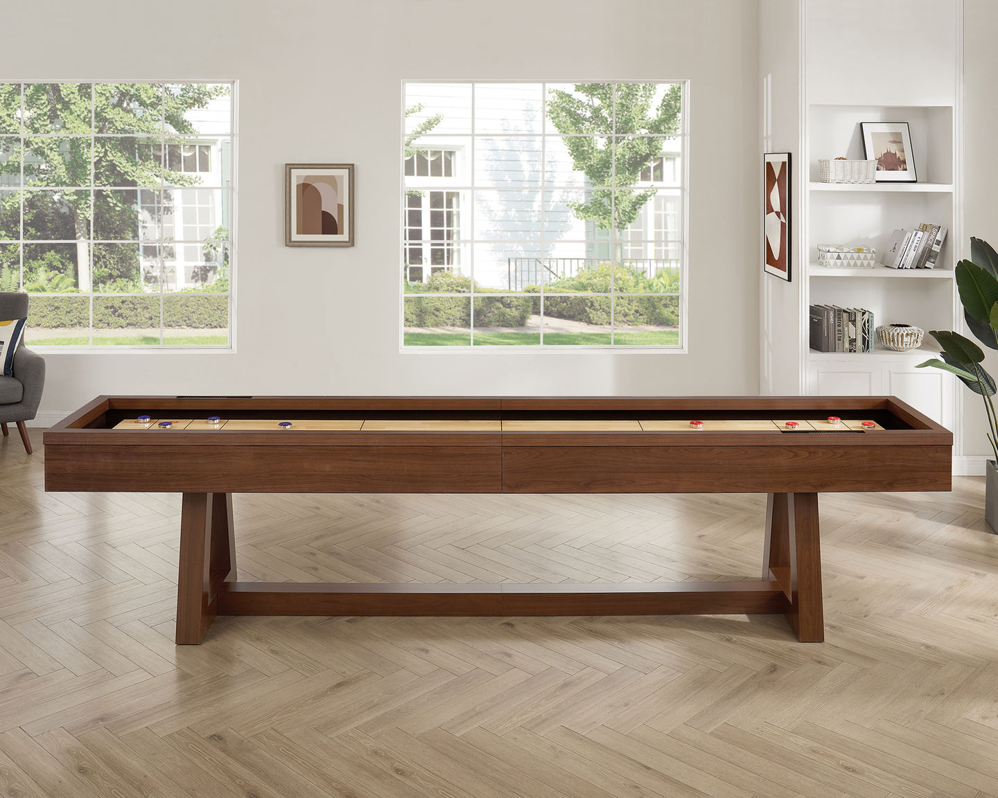 d250613a-285e-44b0-a2e0-38f5c1b14c48|0026-4500|Aiden Shuffleboard|undefined|/product-page/aiden-shuffleboard-1|<p>Introducing the 12' Aiden Shuffleboard Table – where elegance meets durability. Finished in a beautiful coffee color, this table is constructed from premium engineered wood and melamine board, supported by a sturdy 16" wide x 2-1/8" high rubber wood frame. The polymer-coated playfield ensures seamless gameplay, and the built-in climatic adjusters allow you to customize the playing surface. Designed for all skill levels, it features multiple scoring systems for both novice and advanced players. Complete with (8) ABS and chrome-plated steel pucks, the Aiden Shuffleboard Table offers a stylish centerpiece for any game room.</p><p> </p><p><strong>Product Features:</strong></p><ul><li>Polymer Coated Playfield</li><li>Playfield includes Climatic Adjusters bolted into the underside of the board. <ul><li>Since the boards are made of wood, they will naturally contract and expand at times, based on the humidity and temperature levels within the home. The climatic adjusters can be used to help account for these changes and ensure the playfield is properly set for quality game play at all times!</li></ul></li><li>Heavy duty, 16" wide x 2.125" high x 132.5" long Melamine Playfield</li><li>Multiple Scoring Systems for Novice and Advanced Players</li><li>8 pucks included</li><li>(1) Bottle of shuffleboard powder is included</li></ul><p> </p><p><strong>Approximate Product Dimensions: </strong></p><ul><li>12' Size<ul><li>144" L x 25.125" W x 33.75" H, 389 lbs.</li></ul></li></ul><p> </p><p><strong>What it’s Made Of:</strong></p><ul><li>This shuffleboard table is meticulously crafted from engineered wood, melamine board, and vinyl, featuring a rich Coffee finish that enhances its sophisticated appearance while ensuring lasting durability. The playfield is constructed from high-quality melamine board, delivering a strong and stable surface for seamless gameplay. Combining style and performance, this table offers a premium playing experience with its natural elegance.</li></ul>|c0d238_277fe07b005049999f36631ba7deac3d~mv2.jpg|
