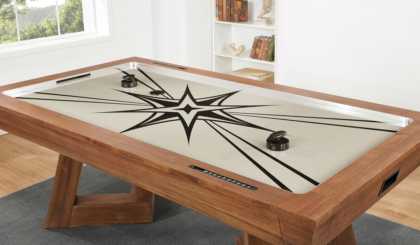 The Aris Air Hockey Table delivers a striking blend of sleek design and competitive fun, making it the perfect centerpiece for any game room or family space. Expertly crafted with a durable engineered wood frame and finished in rich Acacia veneer, this table brings natural warmth and timeless style to your home. The bold starburst graphic on the playfield adds a contemporary edge and visual excitement to every match.
