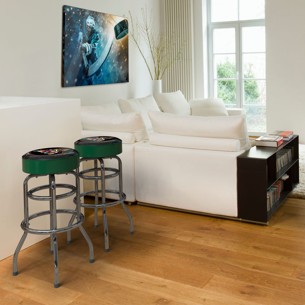 This American-crafted barstool is designed to commercial-grade standards, ensuring durability for years. It is expertly constructed with your favorite team's vibrant colors and logos, guaranteed never to be scratched off. Additionally, the barstool features a 360-degree swivel, providing added convenience and functionality.