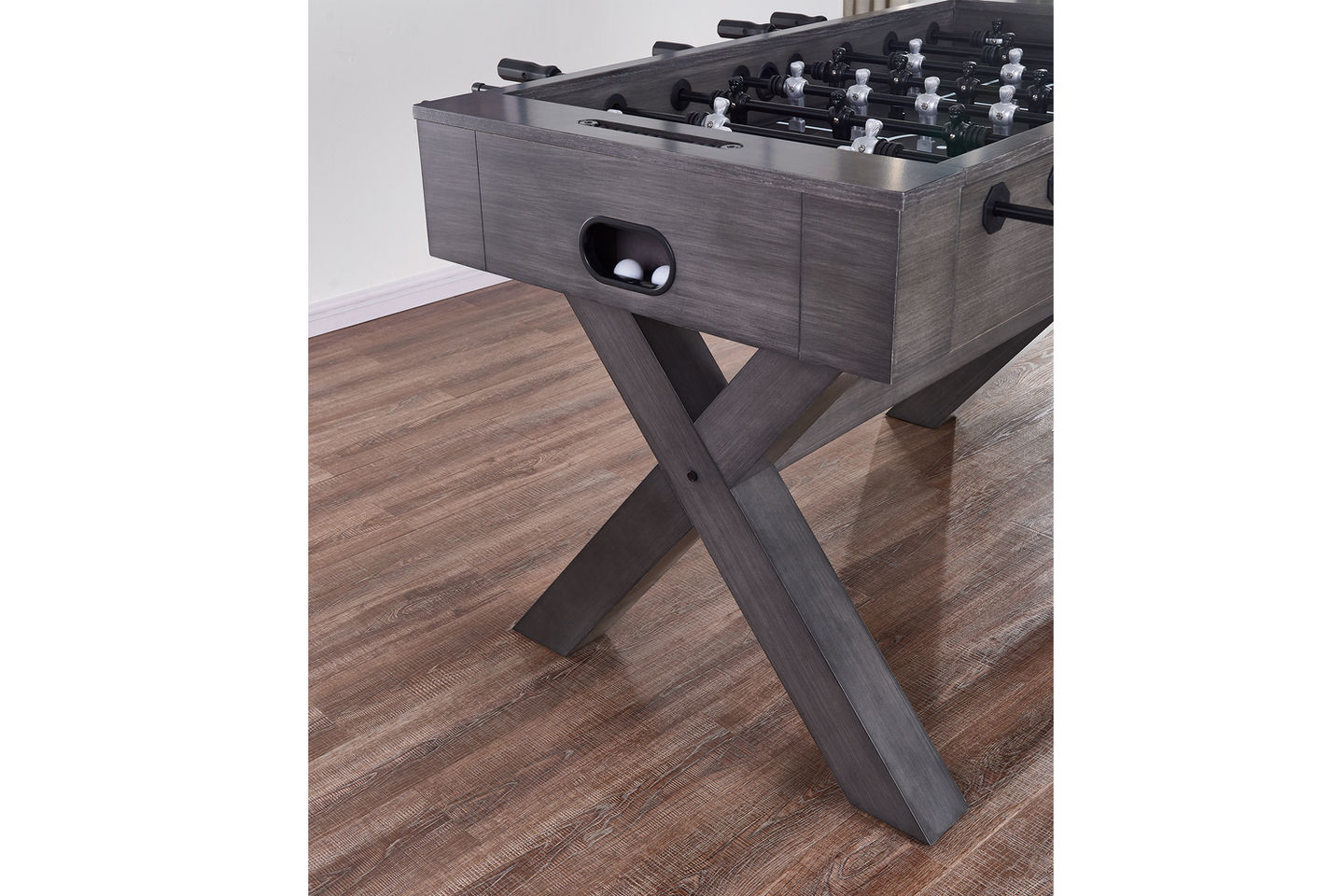 The striking Kona finish of the Blake Foosball Table sets the right tone in any décor and strikes the perfect balance between modern style and sleek design for classic foosball gameplay. Robust x-shaped legs and a bold crossbeam provide the backdrop for contrasting black and gray counterbalanced players molded onto seamless steel rods. Dual manual scorers, two ball returns, and adjustable leg levelers give players hours of solid gaming entertainment.