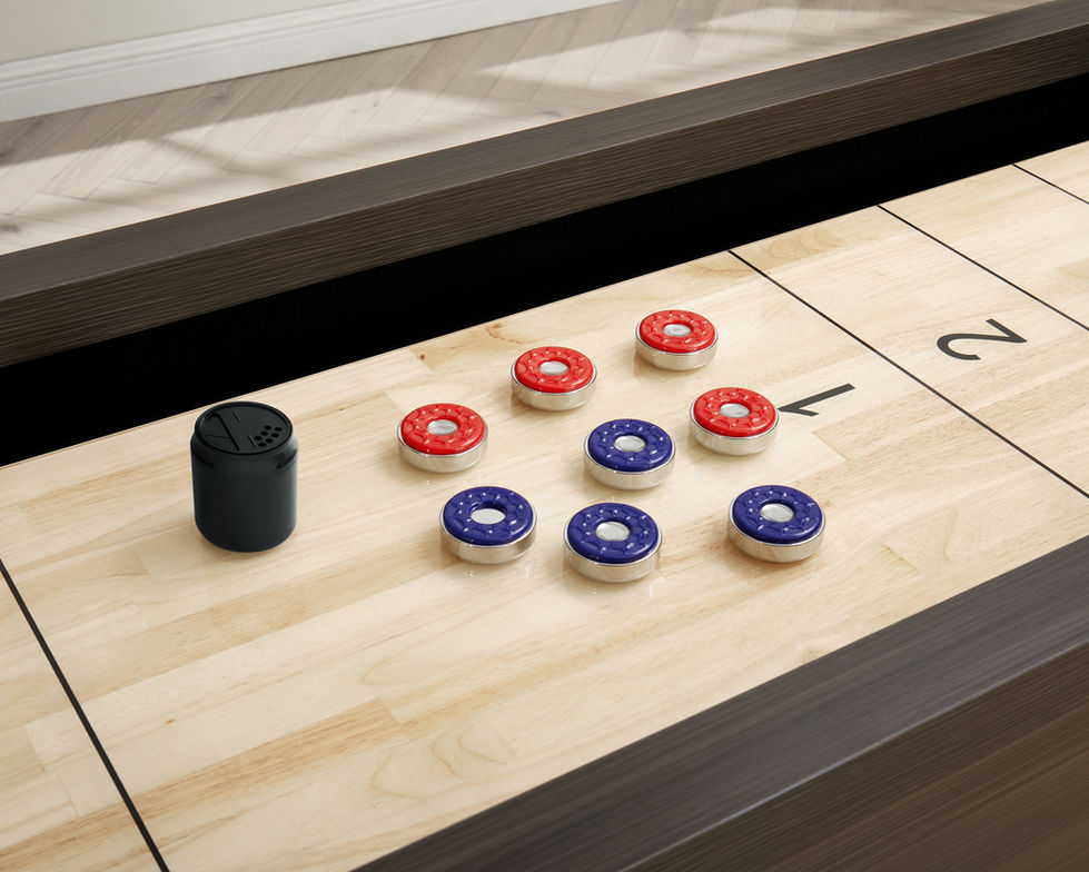 Introducing the 12' Blake Shuffleboard Table – a perfect blend of style, durability, and gameplay precision. Crafted from high-quality Engineered wood and melamine board, this table features a heavy-duty 16" wide x 2-1/8" high rubber wood frame for exceptional stability. The polymer-coated playfield ensures a smooth, fast glide, while built-in climatic adjusters let you fine-tune your game surface. Designed for players of all skill levels, it offers multiple scoring systems to challenge both novices and pros. Complete with 8 ABS and chrome-plated steel pucks, the Blake Shuffleboard delivers endless entertainment for your home.